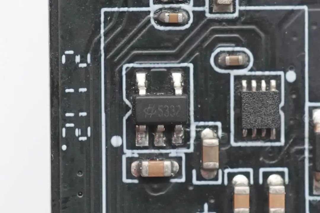 為LED背光和UM3506芯片供電的穩(wěn)壓芯片,絲印5332,來自Holtek合泰,型號為HT7533-2,輸入耐壓33V,輸出電壓3.3V,最大輸出電流100mA,采用SOT23-5封裝。