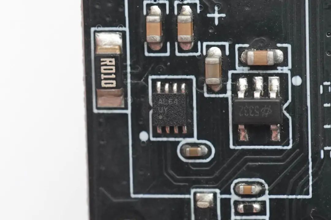 PCBA模塊背面焊接三顆芯片和電流取樣電阻,左側(cè)按鍵用于切換顯示狀態(tài)。