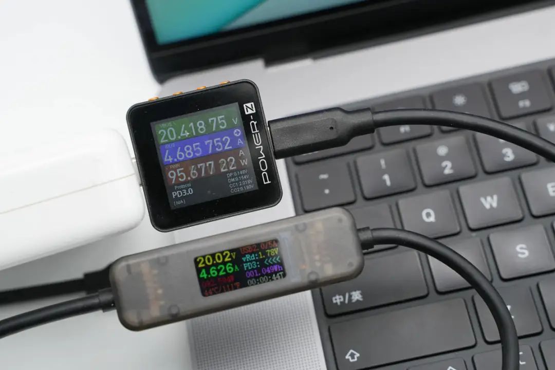 使用這根線纜搭配蘋果充電器給MacBook進行充電,不考慮線纜壓降問題情況下,ChargerLAB POWER-Z KM002C和數(shù)據(jù)線顯示屏顯示充電功率都在95W左右,表明數(shù)據(jù)線支持100W PD快充。