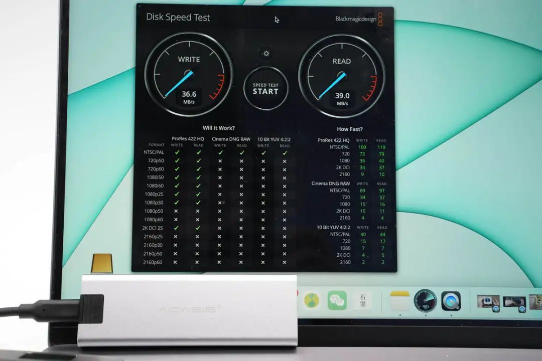 測試線纜的傳輸速度,通過Disk Speed Test我們可以看到線纜的寫入速度約為36.6MB/s,讀取速度約為39MB/s。