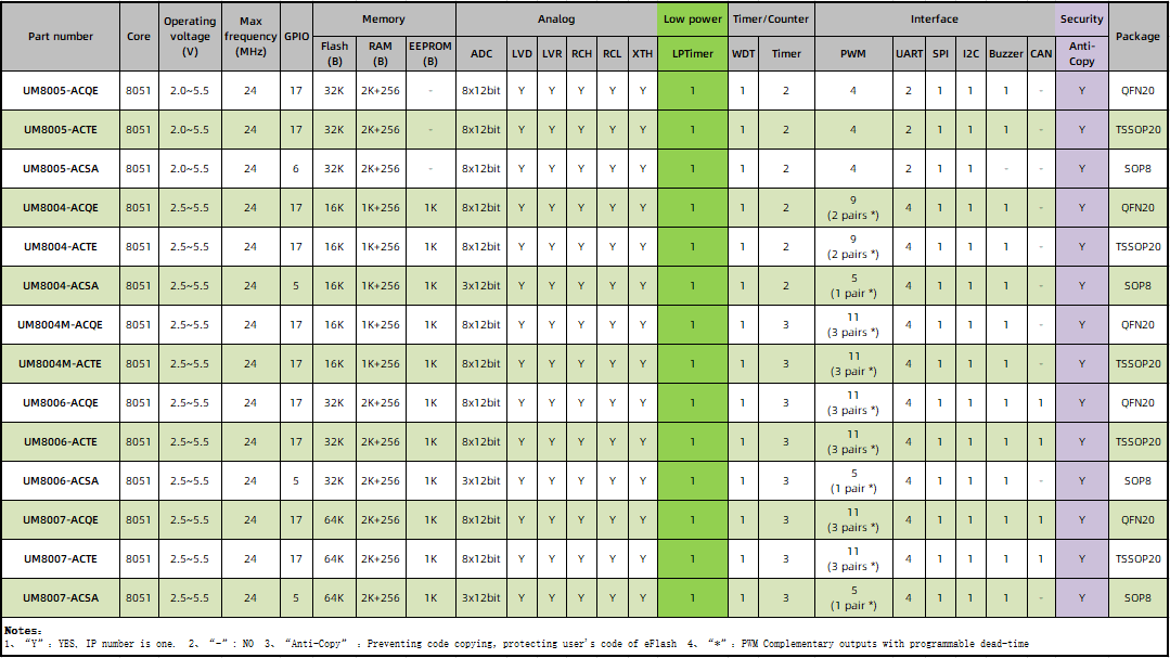 UM800x是廣芯微的超低功耗MCU產(chǎn)品中,8位MCU系列芯片,芯片集成單周期8051內(nèi)核,主頻24MHz,最高內(nèi)存達(dá)到64KB,其帶有豐富的外設(shè)接口、8通道12-bit SAR ADC、低電壓檢測LVD及掉電復(fù)位LVR模塊等,支持多達(dá)11路PWM、4路UART、17路GPIO和1路CAN總線。