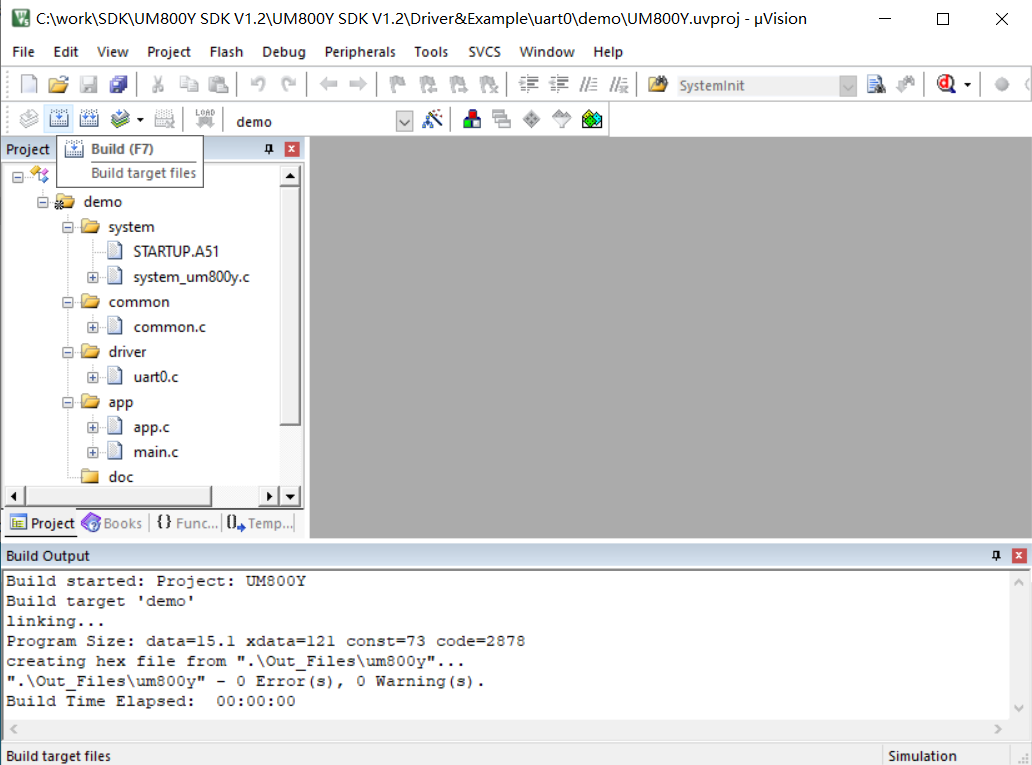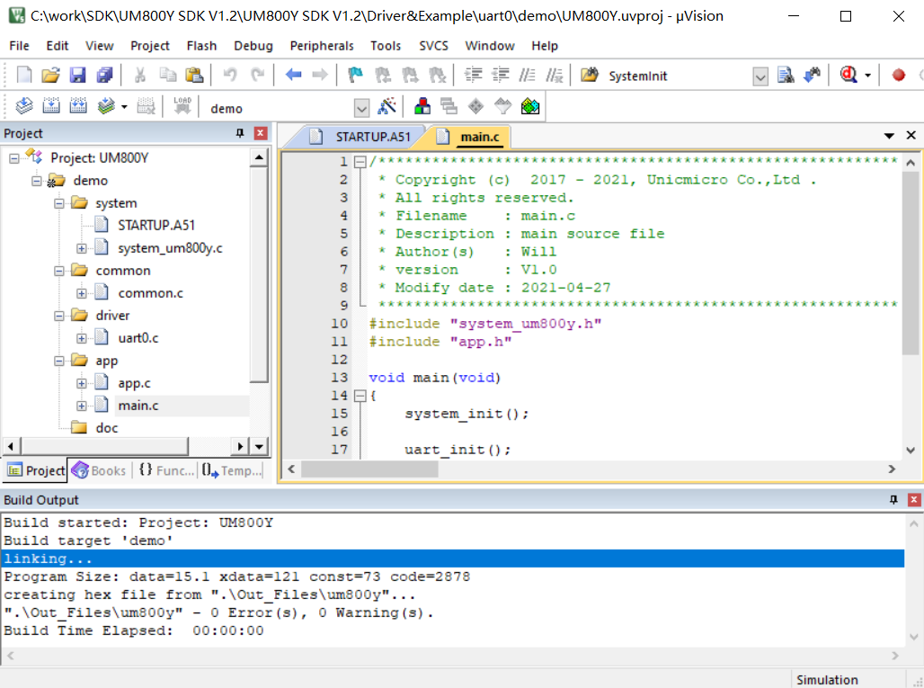這樣uart0示例編譯結(jié)束,Hex輸出文件為 .\Out_Files\um800y.hex。