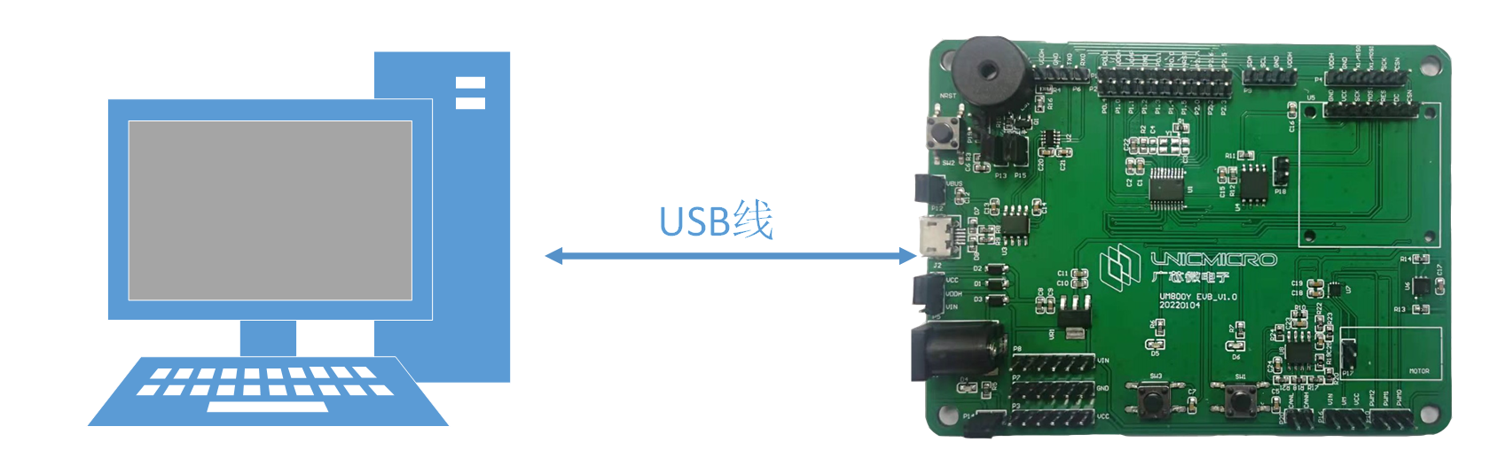1. 用USB線將芯片硬件開發(fā)板與電腦連接起來。USB口能夠供電的同時(shí)也能作為調(diào)試接口,連接如圖3所示。