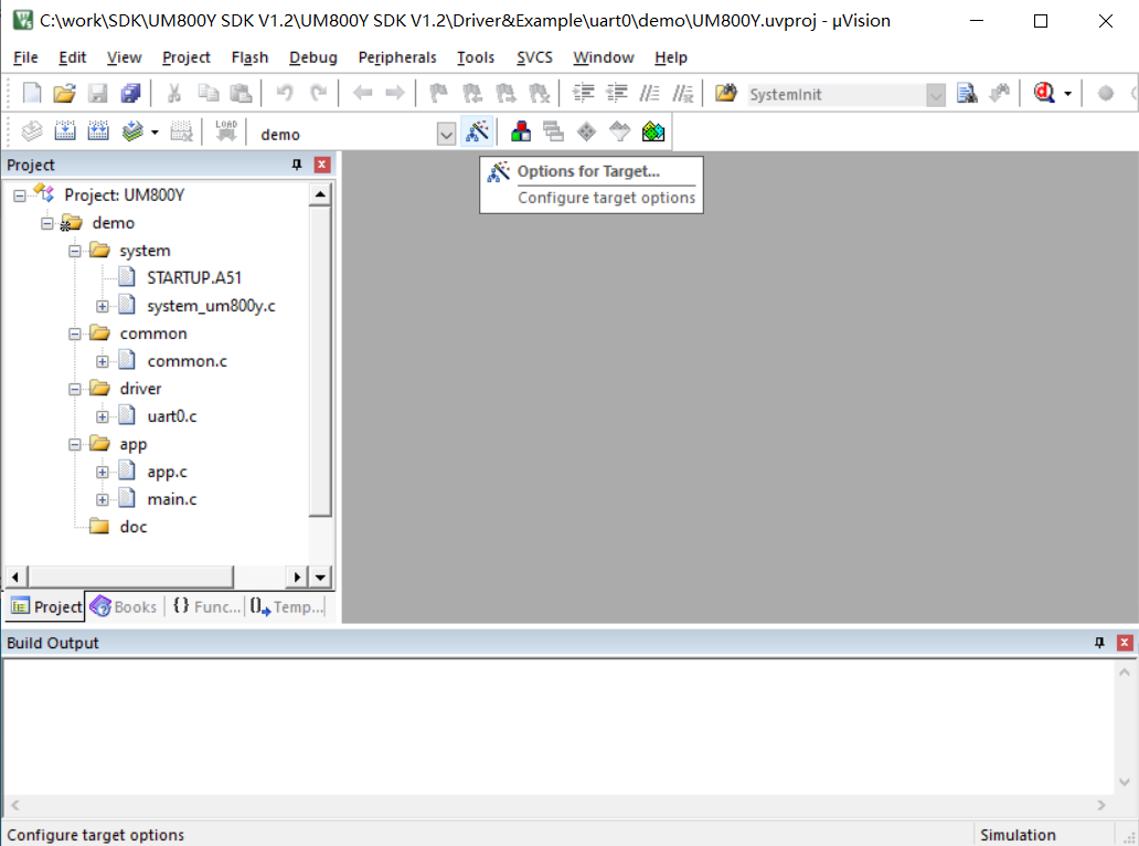 雙擊UM800Y.uvproj工程文件,即可打開工程,工程顯示如圖6所示: