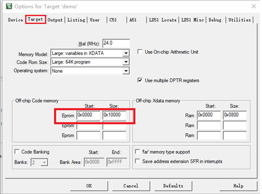 在紅色框內(nèi)填入對應(yīng)芯片的內(nèi)存地址,其中Start均為0x0000,Size分別是: